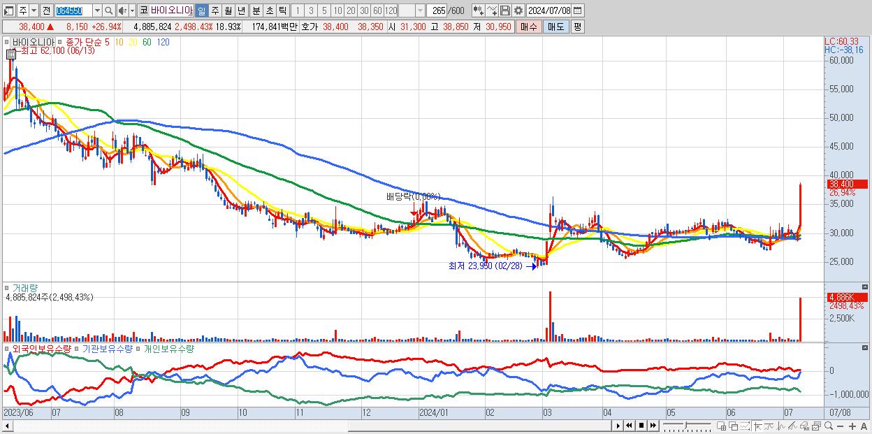 - 바이오니아 (38,400원 ▲ 26.94% , 시총: 9,911억, 거래량: 4,885,824, 거래대금:1,748억)