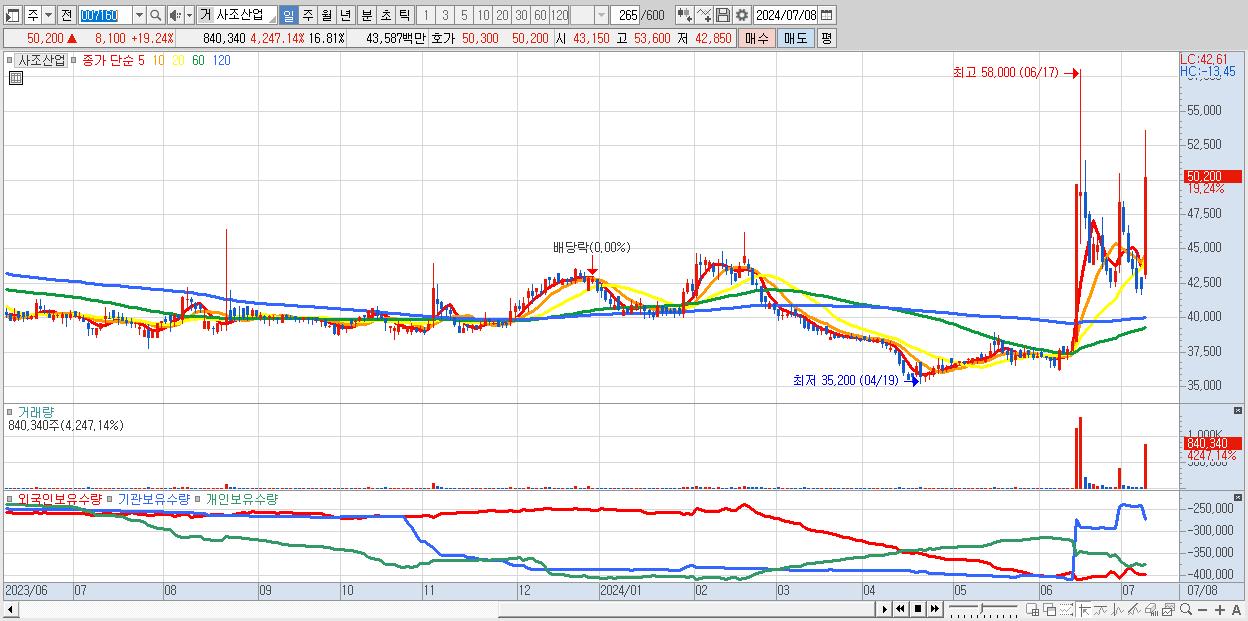 - 사조산업 (50,200원 ▲ 19.24% , 시총: 2,510억, 거래량: 840,340, 거래대금:436억)