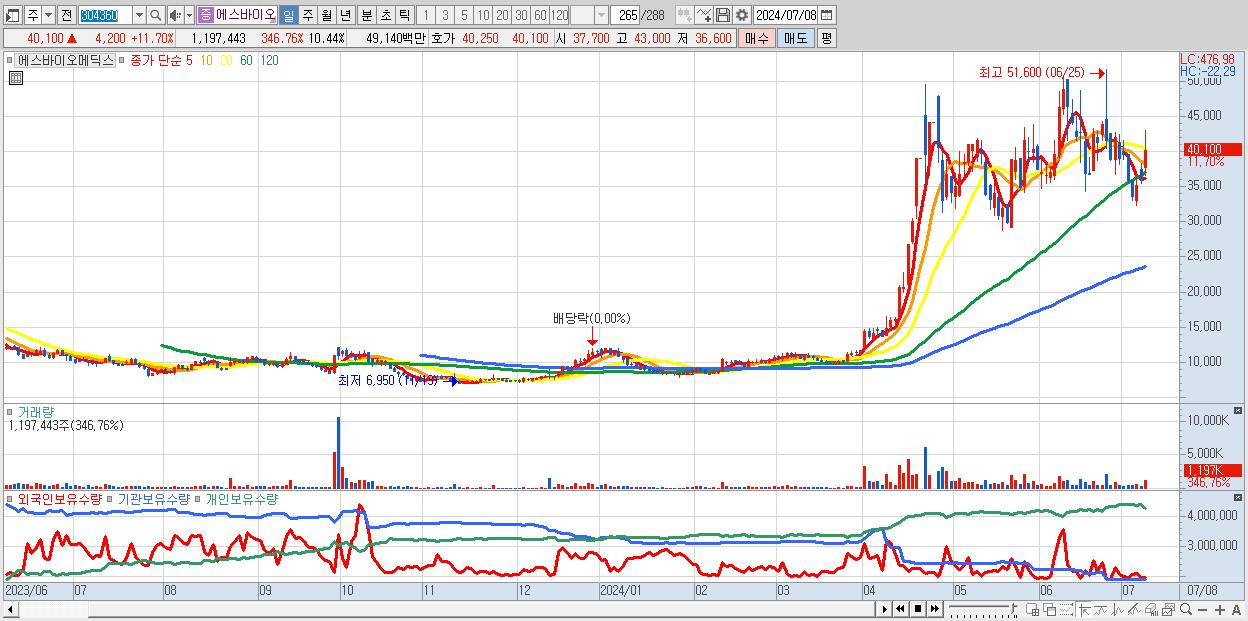 - 에스바이오메딕스 (40,100원 ▲ 11.7% , 시총: 4,601억, 거래량: 1,197,443, 거래대금:491억)