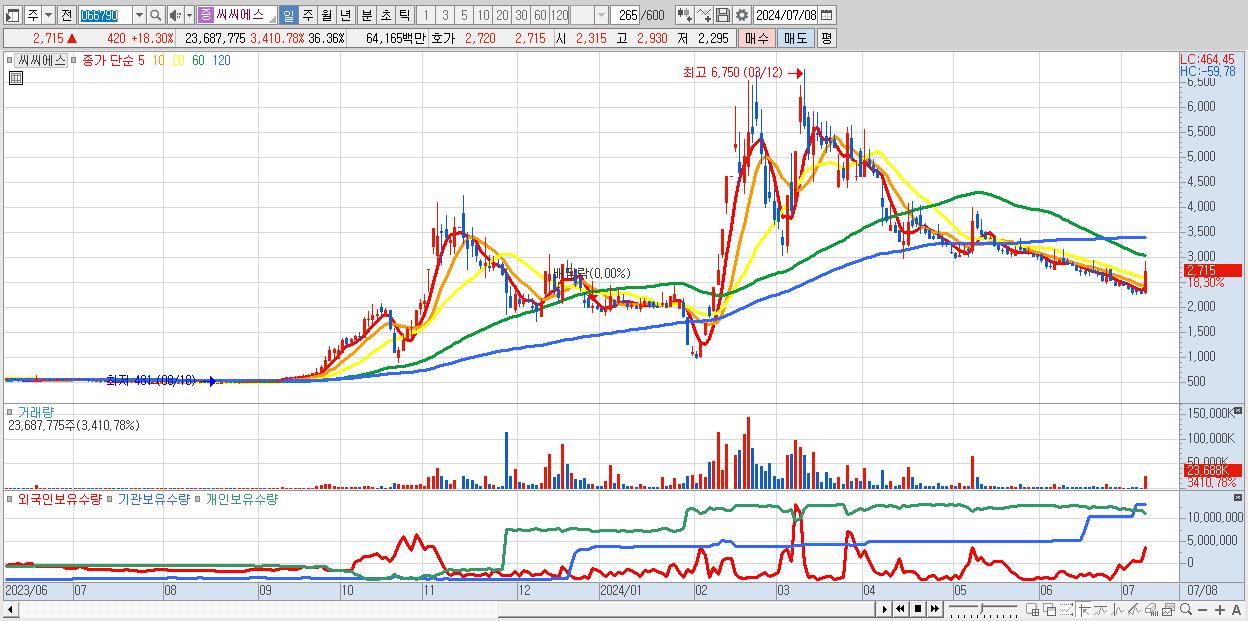 - 씨씨에스 (2,715원 ▲ 18.3% , 시총: 1,769억, 거래량: 23,687,775, 거래대금:642억)