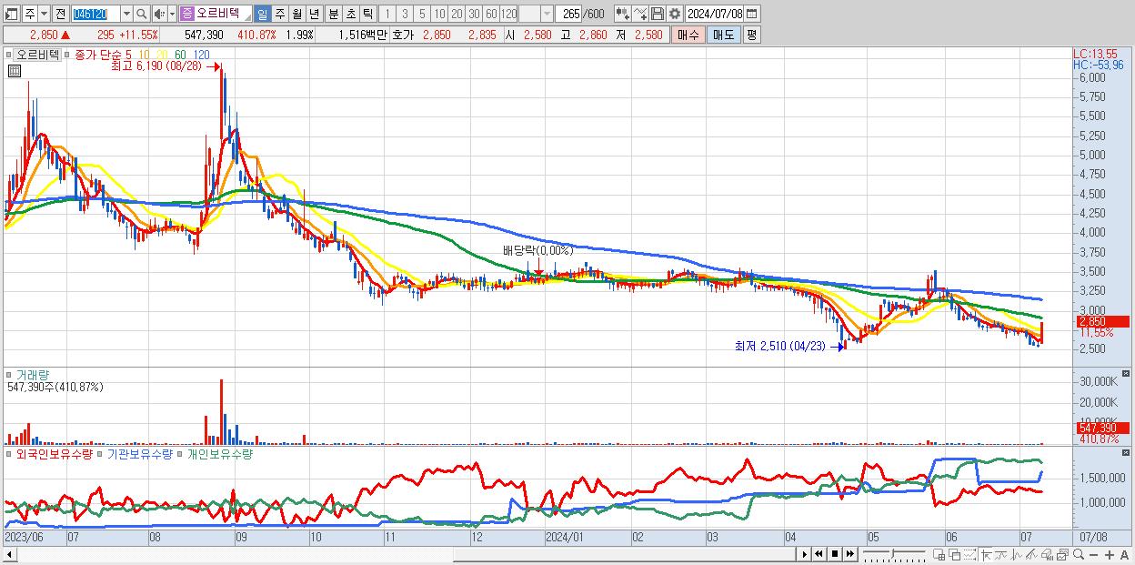 - 오르비텍 (2,850원 ▲ 11.55% , 시총: 782억, 거래량: 547,390, 거래대금:15억)