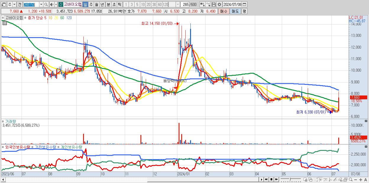 - 고바이오랩 (7,660원 ▲ 18.58% , 시총: 1,481억, 거래량: 3,451,723, 거래대금:269억)