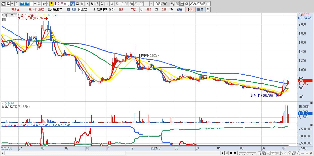 - 메디콕스 (762원 ▲ 11.08% , 시총: 435억, 거래량: 8,460,547, 거래대금:62억)