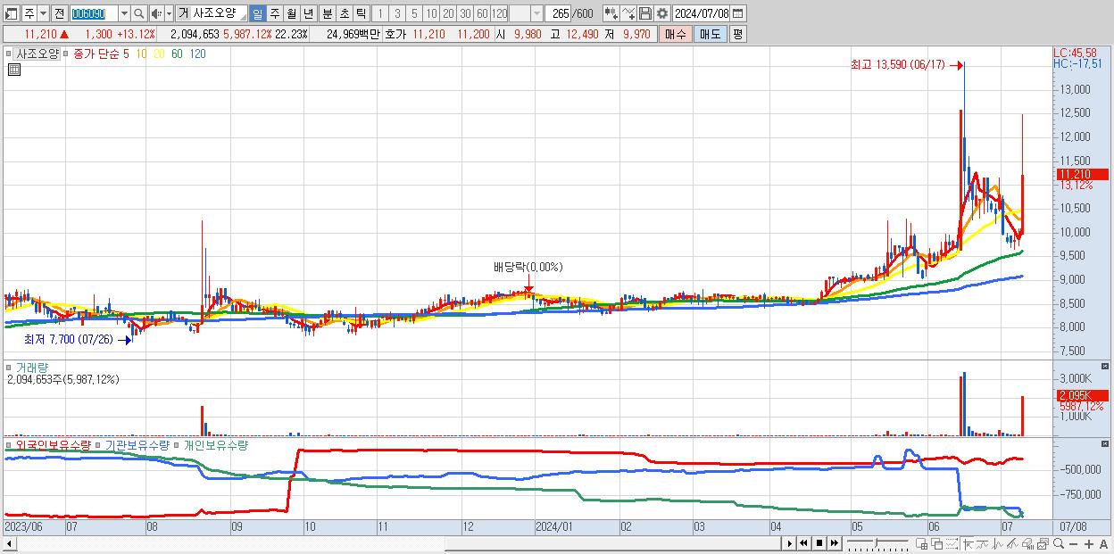 - 사조오양 (11,210원 ▲ 13.12% , 시총: 1,056억, 거래량: 2,094,653, 거래대금:250억)