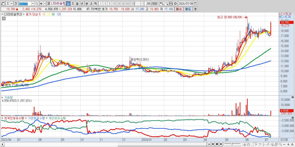 - LS마린솔루션 (19,700원 ▲ 14.27% , 시총: 5,655억, 거래량: 4,558,878, 거래대금:877억)