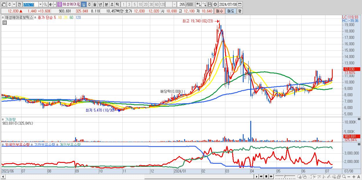 - 해성에어로보틱스 (12,030원 ▲ 13.6% , 시총: 1,340억, 거래량: 903,691, 거래대금:105억)