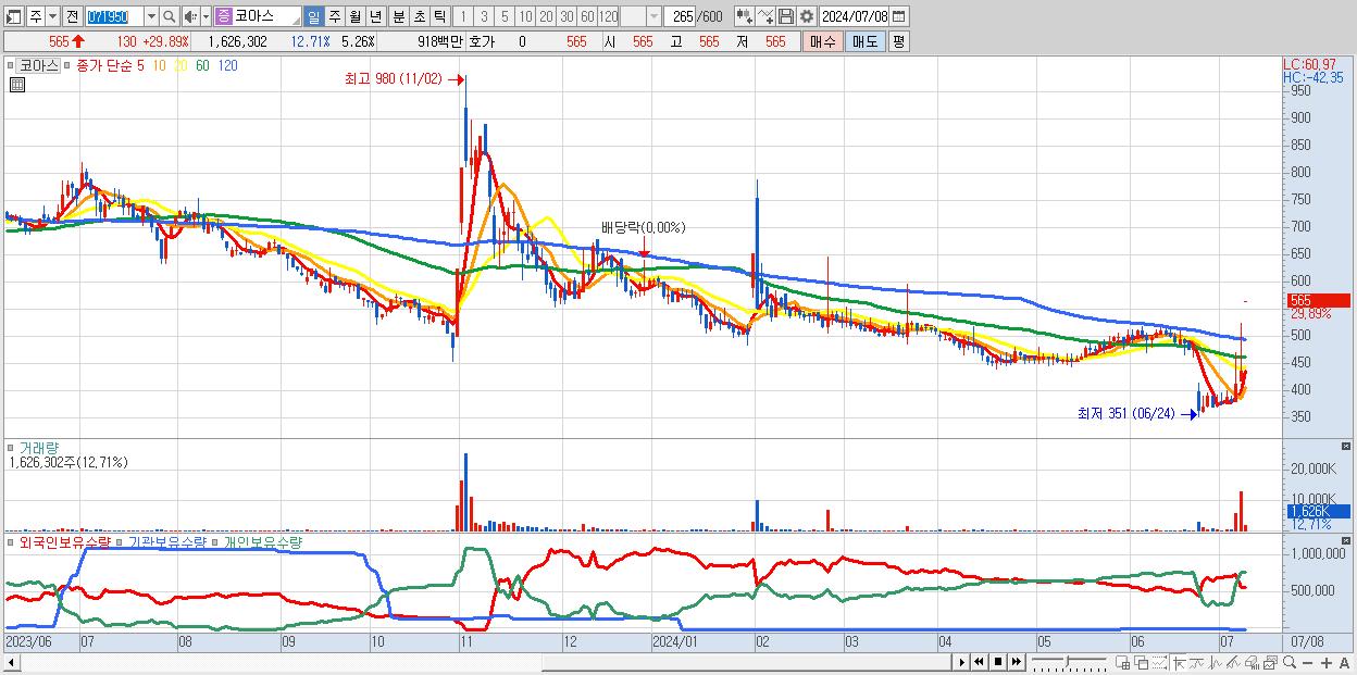 - 코아스 (565원 ▲ 29.89% , 시총: 175억, 거래량: 1,626,302, 거래대금:9억)