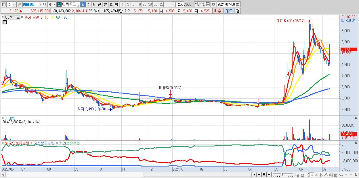 - CJ씨푸드 (5,170원 ▲ 15.53% , 시총: 1,858억, 거래량: 20,423,882, 거래대금:1,054억)