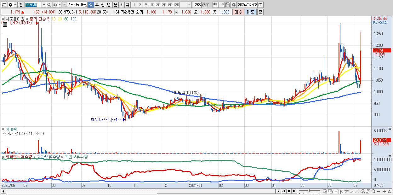 - 사조동아원 (1,179원 ▲ 14.8% , 시총: 1,664억, 거래량: 28,973,941, 거래대금:348억)