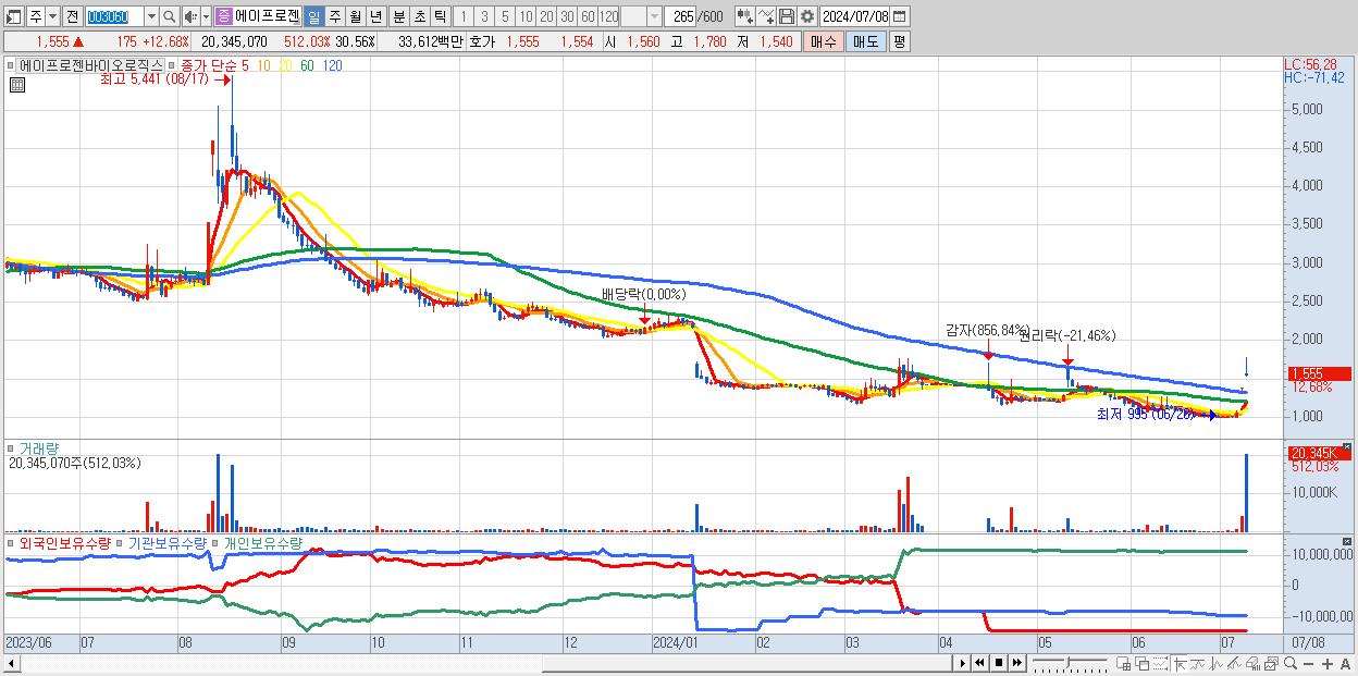 - 에이프로젠바이오로직스 (1,555원 ▲ 12.68% , 시총: 1,035억, 거래량: 20,345,070, 거래대금:336억)