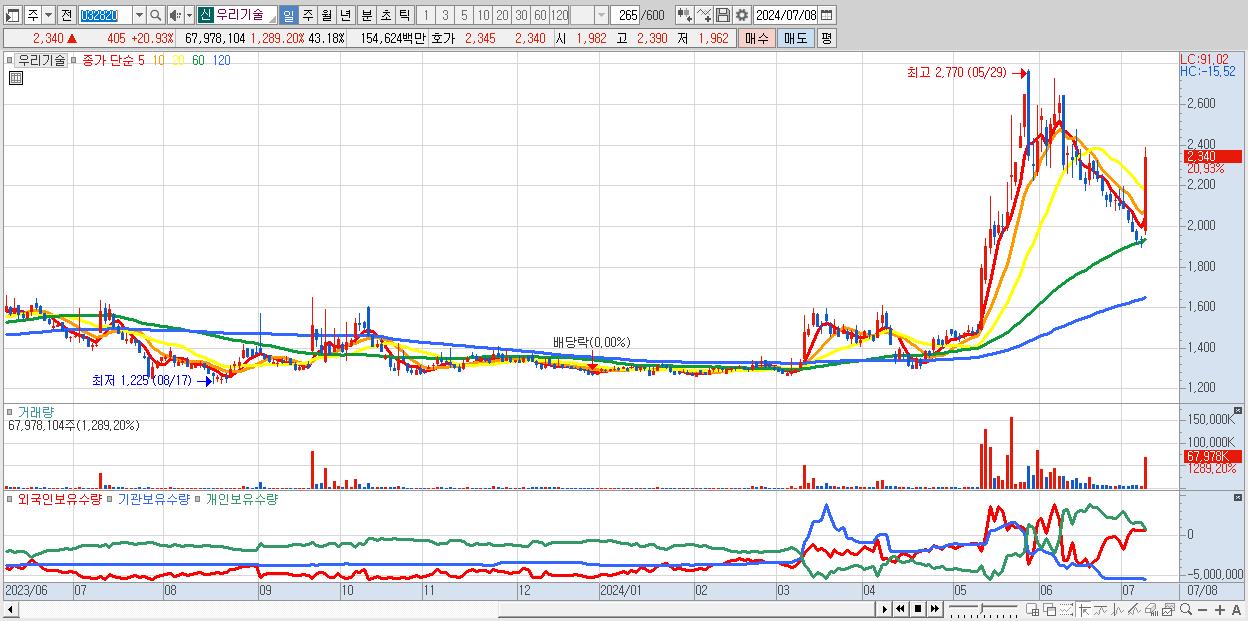 - 우리기술 (2,340원 ▲ 20.93% , 시총: 3,684억, 거래량: 67,978,104, 거래대금:1,546억)
