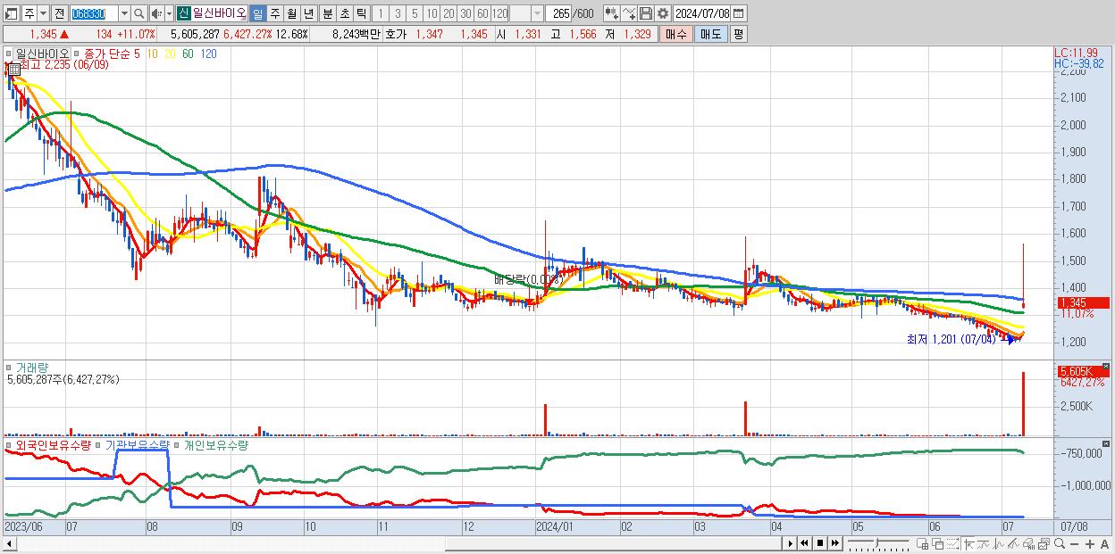 - 일신바이오 (1,345원 ▲ 11.07% , 시총: 595억, 거래량: 5,605,287, 거래대금:82억)