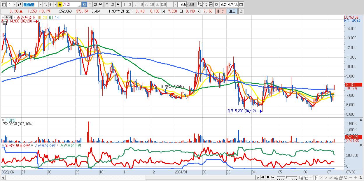 - 캐리 (8,130원 ▲ 18.17% , 시총: 593억, 거래량: 252,069, 거래대금:19억)