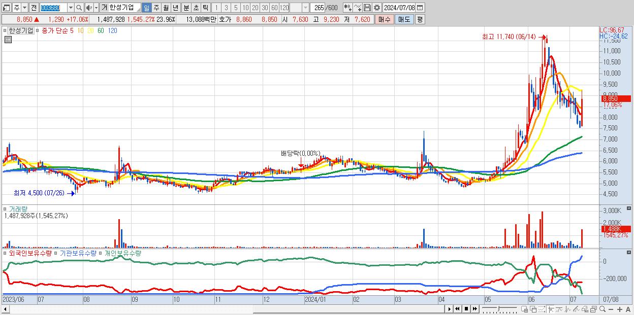 - 한성기업 (8,850원 ▲ 17.06% , 시총: 550억, 거래량: 1,487,928, 거래대금:131억)