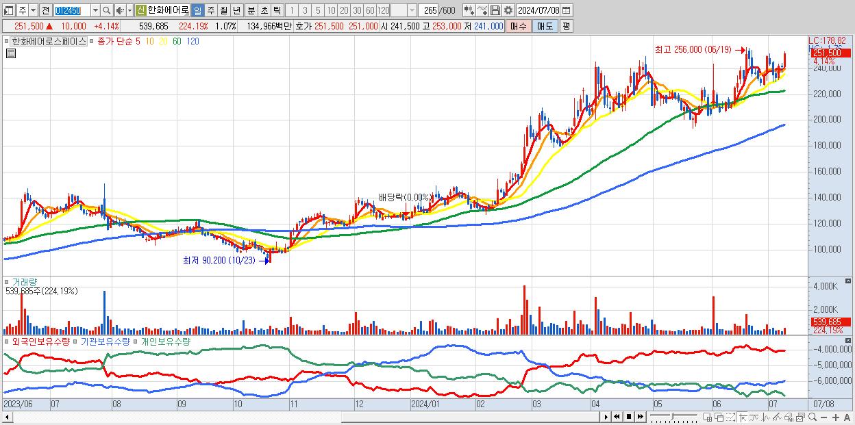 - 한화에어로스페이스 (251,500원 ▲ 4.14% , 시총: 127,334억, 외국인 순매수 거래금:282억)