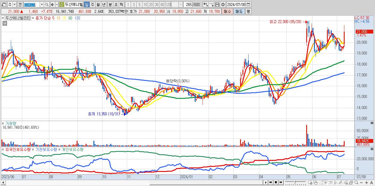 - 두산에너빌리티 (21,000원 ▲ 7.47% , 시총: 134,518억, 외국인 순매수 거래금:468억)
