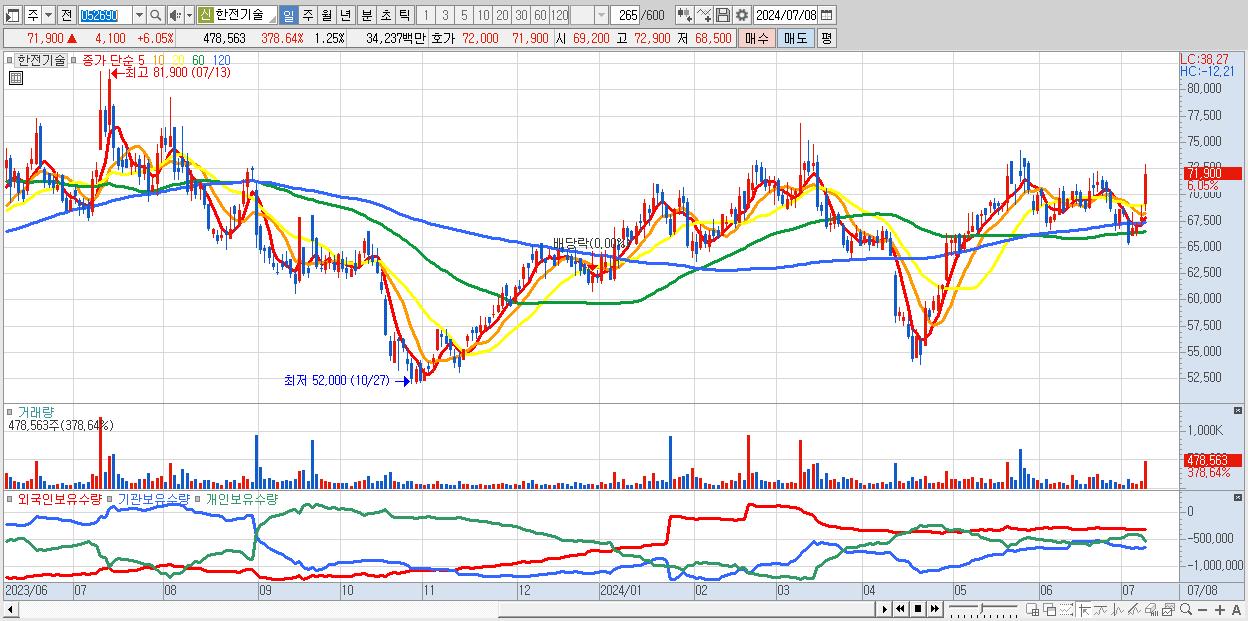 - 한전기술 (71,900원 ▲ 6.05% , 시총: 27,480억, 외국인 순매수 거래금:115억)