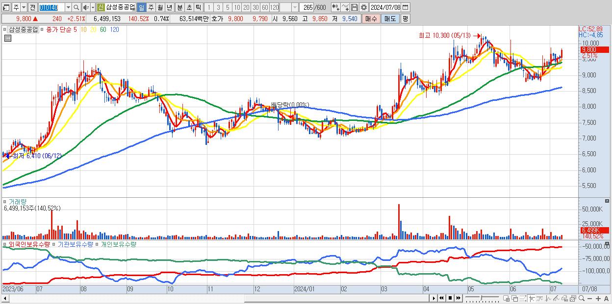 - 삼성중공업 (9,800원 ▲ 2.51% , 시총: 86,240억, 외국인 순매수 거래금:169억)
