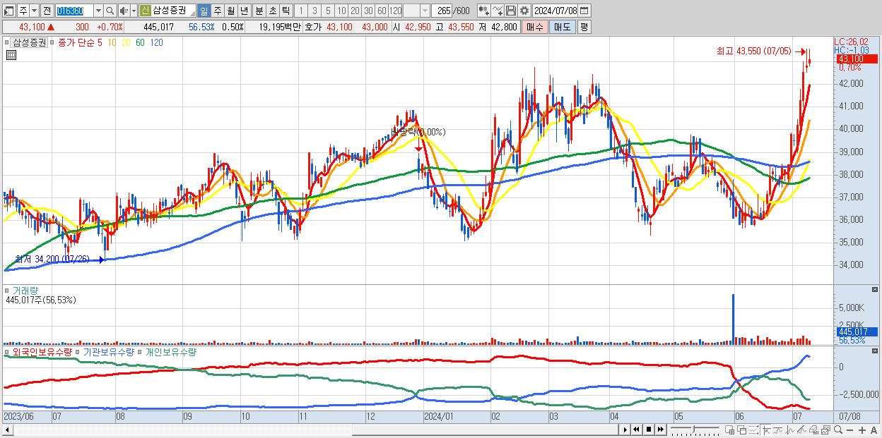 - 삼성증권 (43,100원 ▲ 0.7% , 시총: 38,488억, 외국인 순매수 거래금:51억)