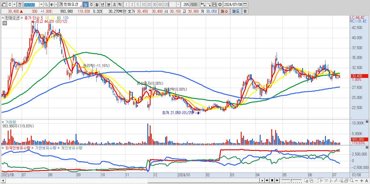 - 한화오션 (30,400원 ▲ 1% , 시총: 93,133억, 외국인 순매수 거래금:56억)