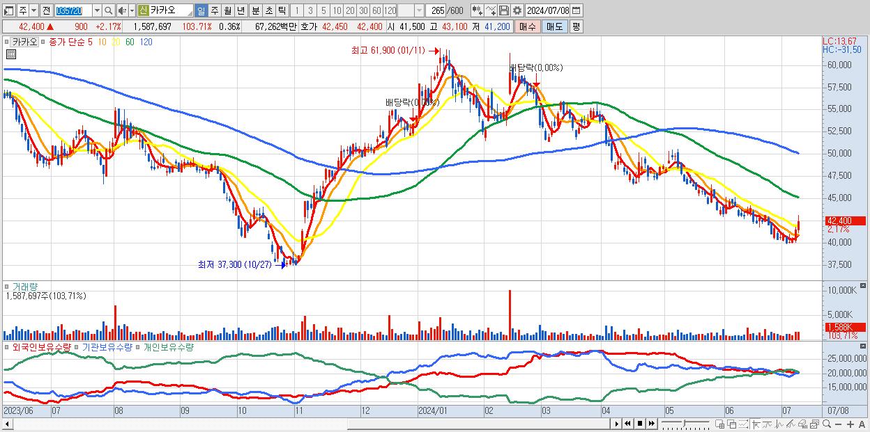 - 카카오 (42,400원 ▲ 2.17% , 시총: 188,000억, 외국인 순매수 거래금:86억)