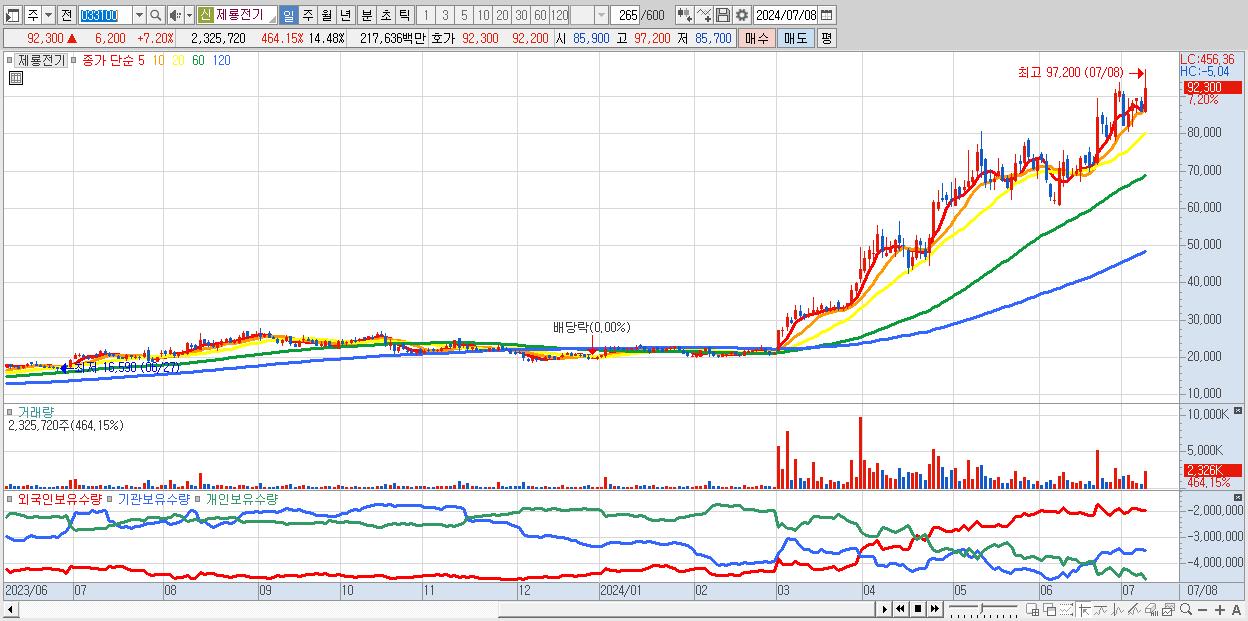 - 제룡전기 (92,300원 ▲ 7.2% , 시총: 14,826억, 외국인 순매수 거래금:239억)