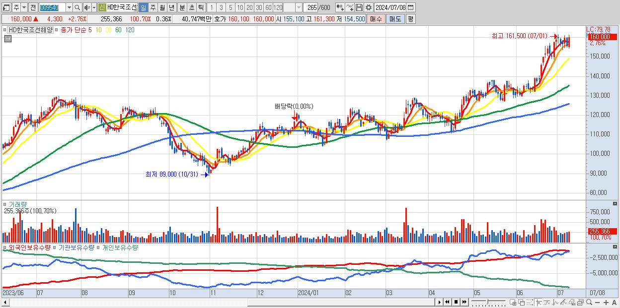 - HD한국조선해양 (160,000원 ▲ 2.76% , 시총: 113,237억, 외국인 순매수 거래금:109억)