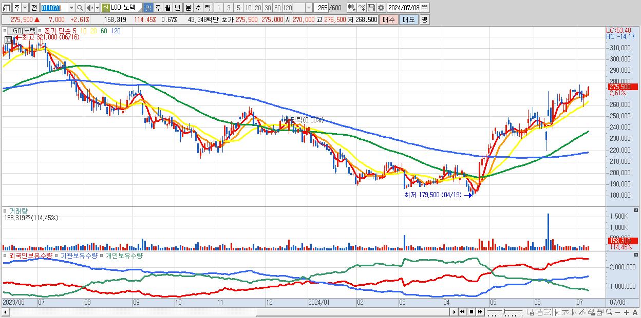 - LG이노텍 (275,500원 ▲ 2.61% , 시총: 65,203억, 외국인 순매수 거래금:69억)