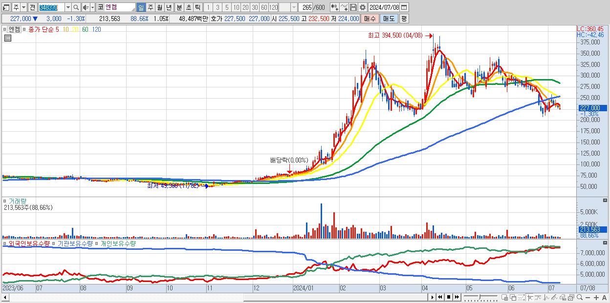 - 엔켐 (227,000원 ▼ -1.3% , 시총: 46,150억, 외국인 순매수 거래금:51억)