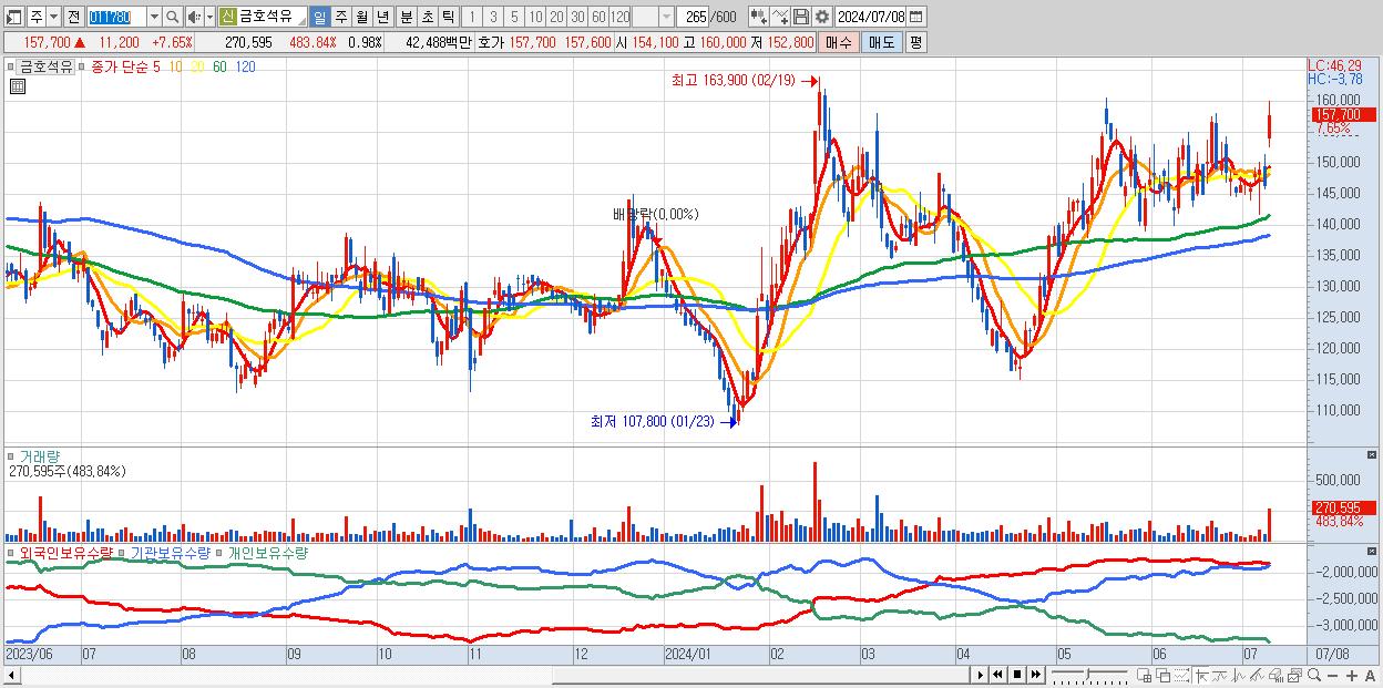 - 금호석유 (157,700원 ▲ 7.65% , 시총: 43,640억, 외국인 순매수 거래금:65억)