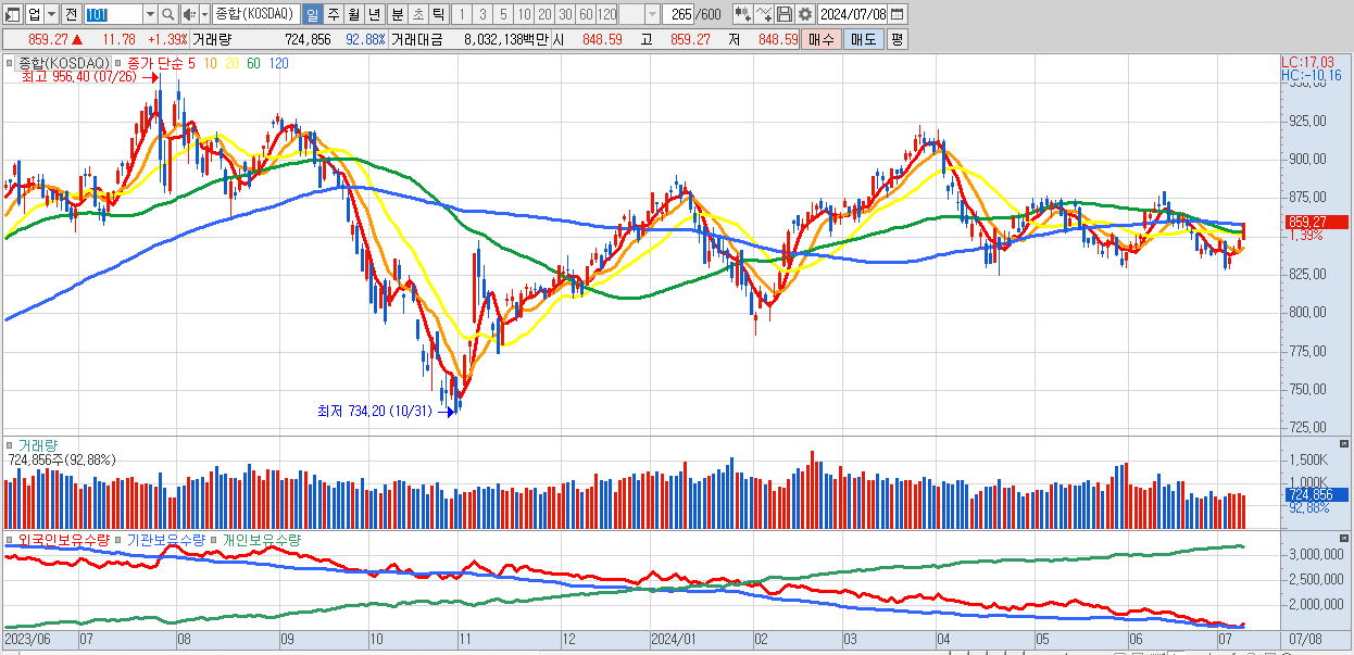 | 07/08 | 859.27 | ▲1.39% | -367억 | 792억 | -490억 | 65억 |