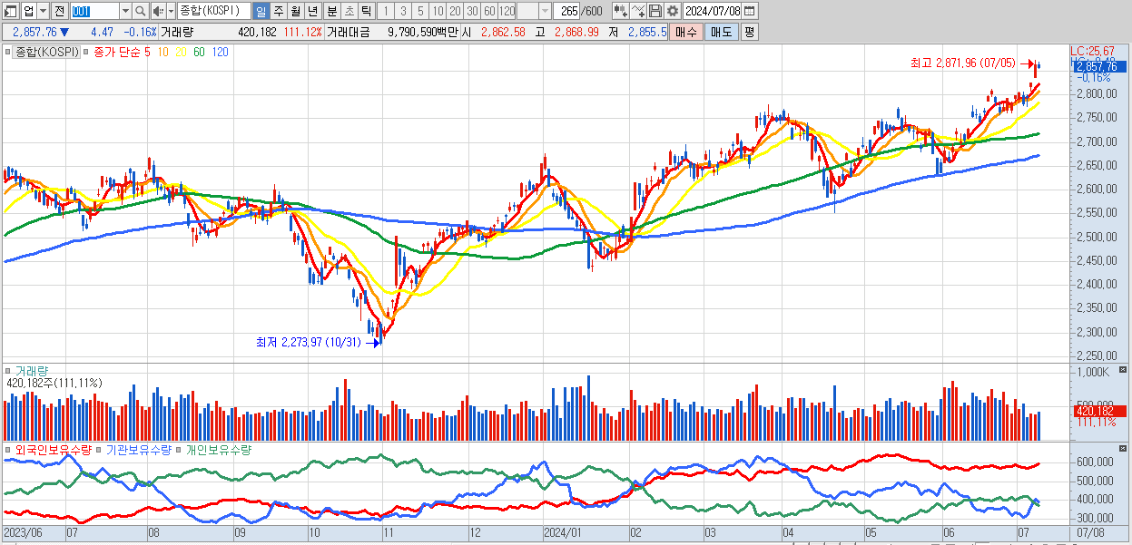 | 07/08 | 2,857.76 | ▼-0.16% | -1,875억 | 5,298억 | -3,471억 | 48억 |
