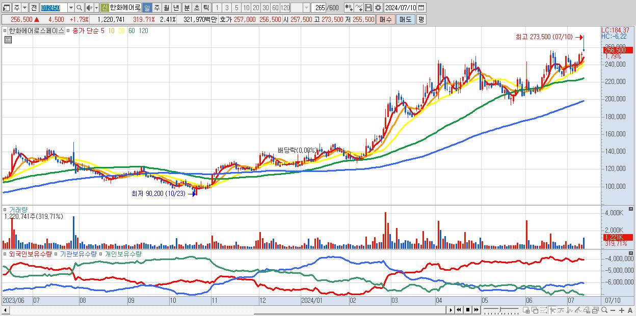 - 한화에어로스페이스 (256,500원 ▲ 1.79% , 시총: 129,866억, 거래량: 1,220,741, 거래대금:3,220억, KOSPI)