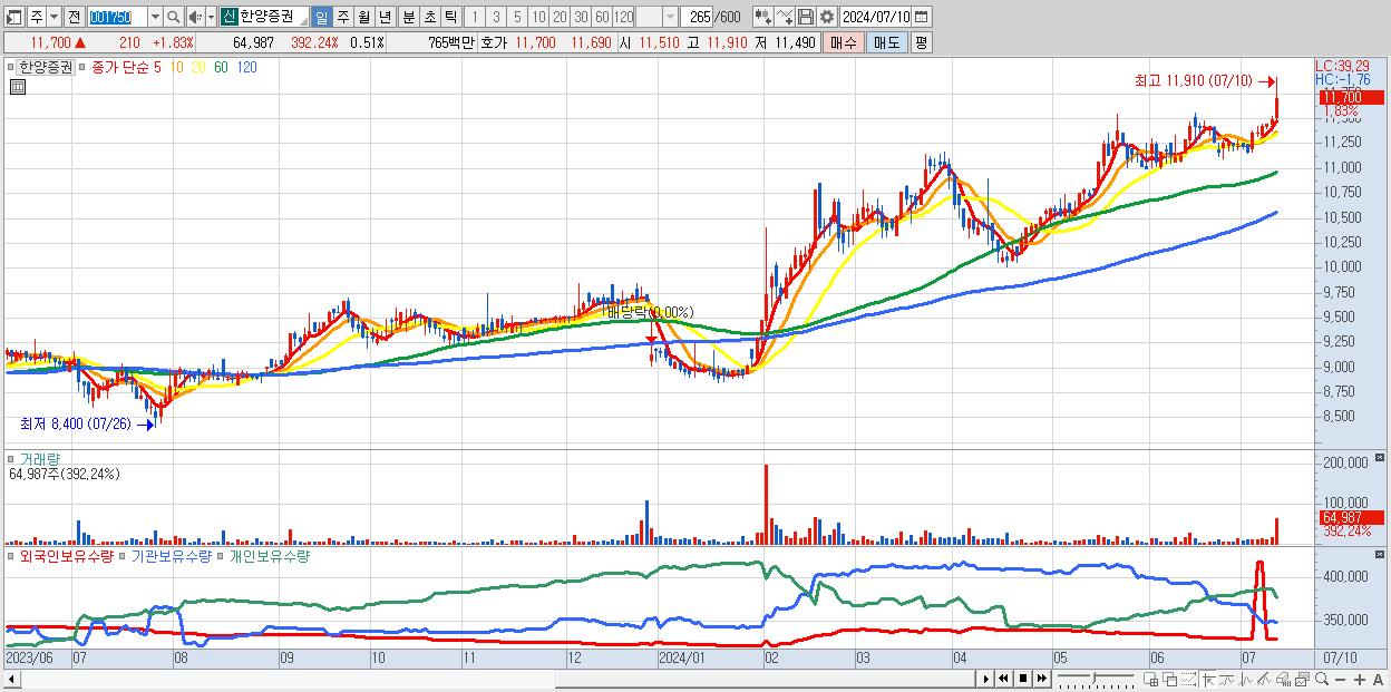 - 한양증권 (11,700원 ▲ 1.83% , 시총: 1,489억, 거래량: 64,987, 거래대금:8억, KOSPI)