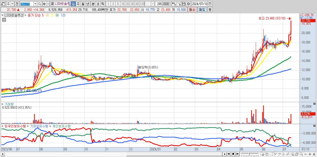- LS마린솔루션 (22,700원 ▲ 14.36% , 시총: 6,516억, 거래량: 8,528,958, 거래대금:1,894억, KOSDAQ)