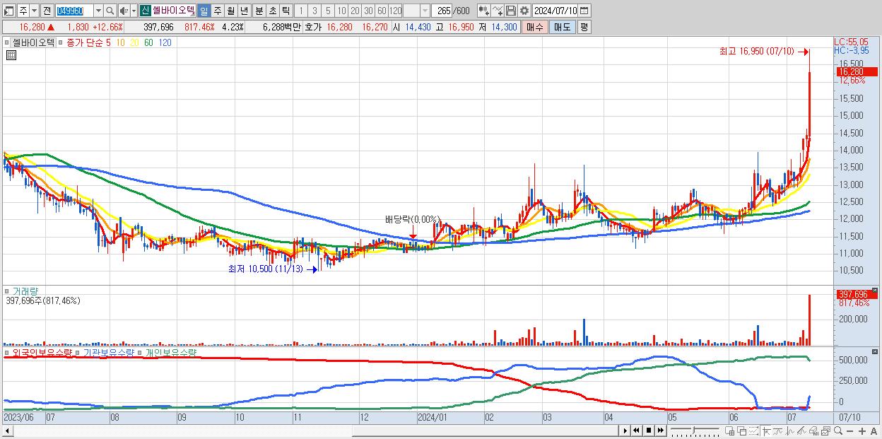 - 쎌바이오텍 (16,280원 ▲ 12.66% , 시총: 1,530억, 거래량: 397,696, 거래대금:63억, KOSDAQ)