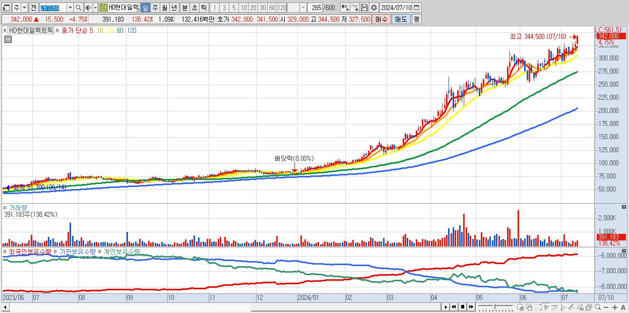 - HD현대일렉트릭 (342,000원 ▲ 4.75% , 시총: 123,281억, 거래량: 391,183, 거래대금:1,324억, KOSPI)