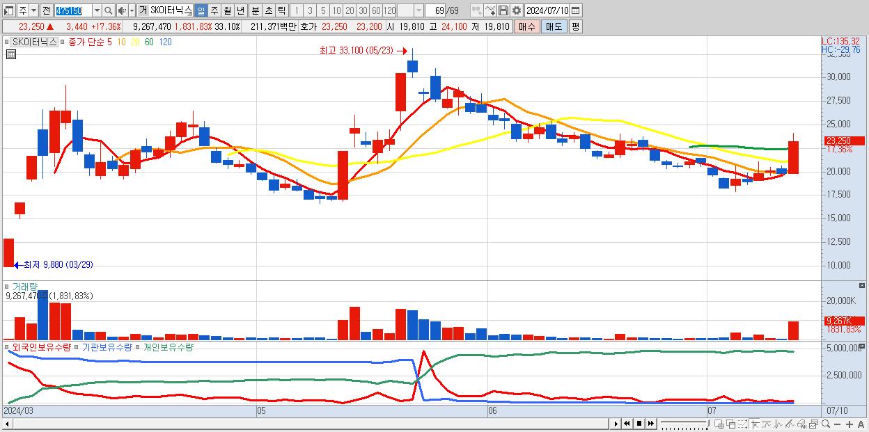 - SK이터닉스 (23,250원 ▲ 17.36% , 시총: 6,509억, 거래량: 9,267,470, 거래대금:2,114억)