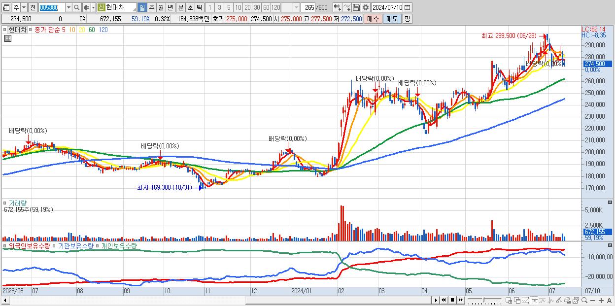- 현대차 (274,500원 0% , 시총: 574,847억, 거래량: 672,155, 거래대금:1,848억)