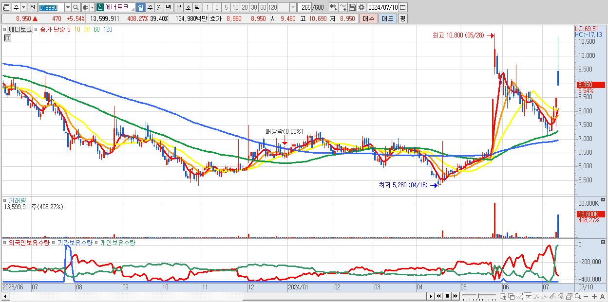 - 에너토크 (8,950원 ▲ 5.54% , 시총: 873억, 거래량: 13,599,911, 거래대금:1,350억)