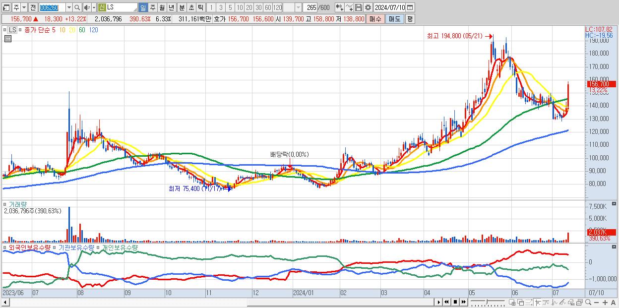 - LS (156,700원 ▲ 13.22% , 시총: 50,457억, 거래량: 2,036,796, 거래대금:3,112억)