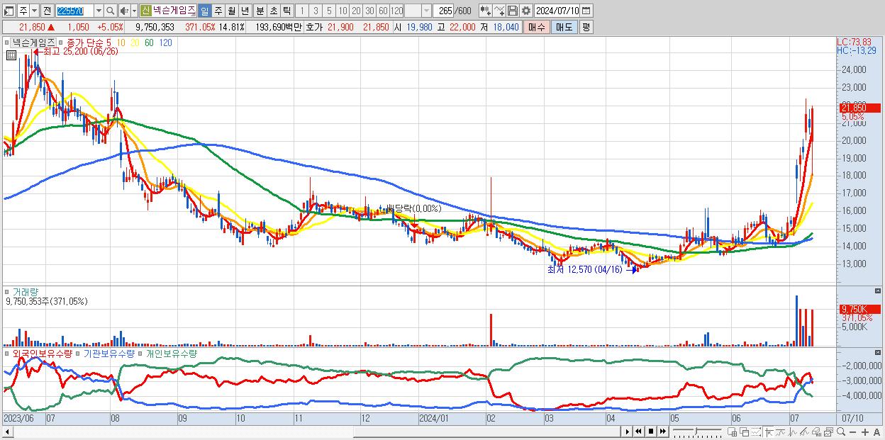 - 넥슨게임즈 (21,850원 ▲ 5.05% , 시총: 14,382억, 거래량: 9,750,353, 거래대금:1,937억)