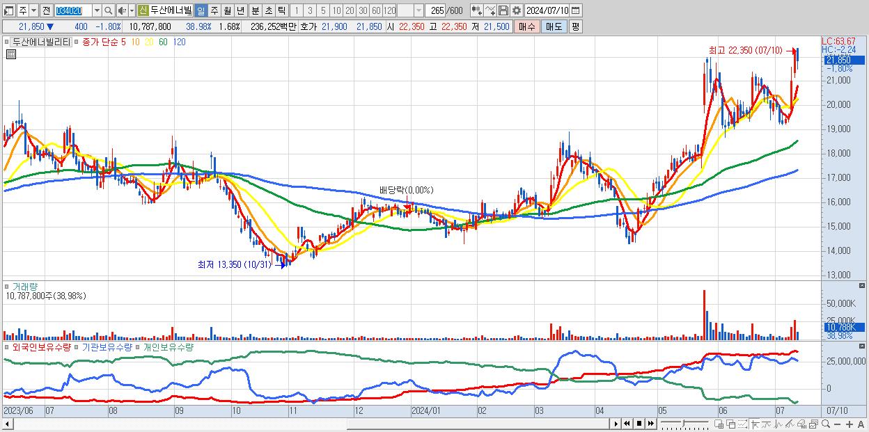 - 두산에너빌리티 (21,850원 ▼ -1.8% , 시총: 139,963억, 거래량: 10,787,800, 거래대금:2,363억)