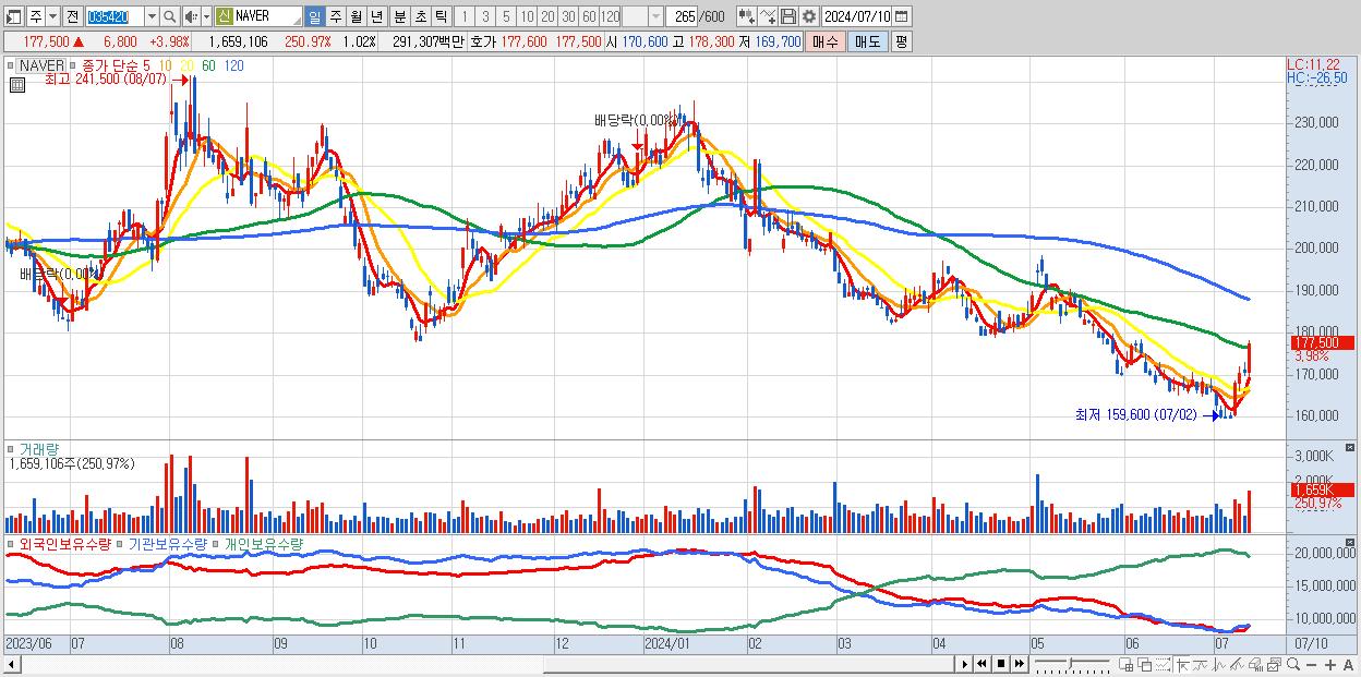 - NAVER (177,500원 ▲ 3.98% , 시총: 288,275억, 거래량: 1,659,106, 거래대금:2,913억)