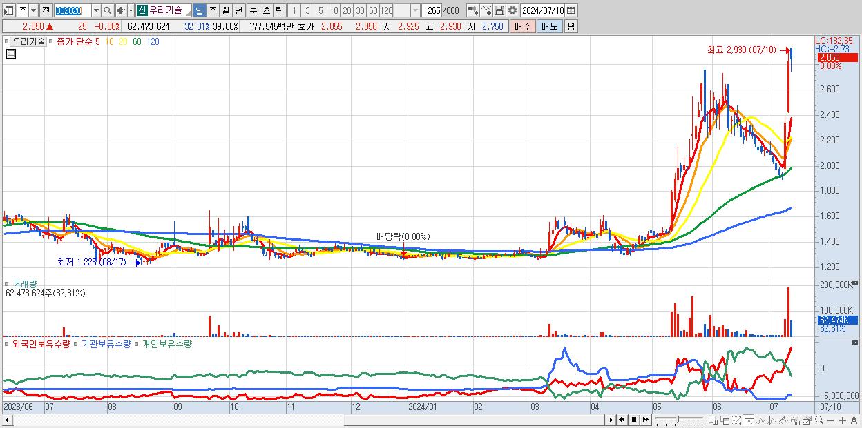 - 우리기술 (2,850원 ▲ 0.88% , 시총: 4,487억, 거래량: 62,473,624, 거래대금:1,775억)