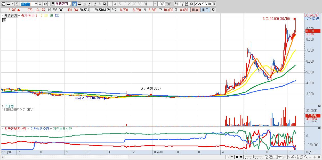 - 세명전기 (8,780원 ▲ 3.17% , 시총: 1,339억, 거래량: 19,896,089, 거래대금:1,895억)