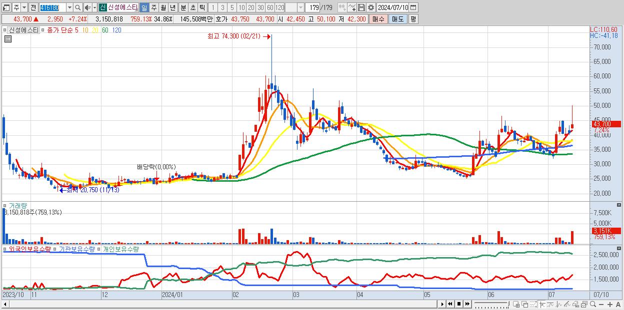 - 신성에스티 (43,700원 ▲ 7.24% , 시총: 3,950억, 거래량: 3,150,818, 거래대금:1,455억)