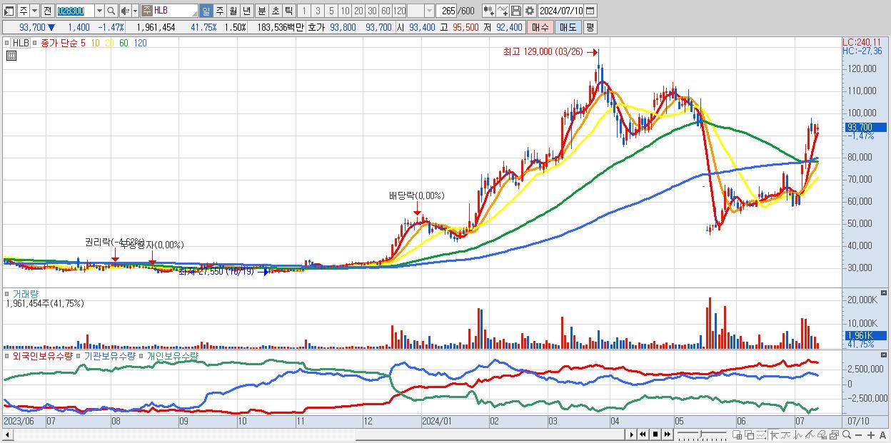 - HLB (93,700원 ▼ -1.47% , 시총: 122,602억, 거래량: 1,961,454, 거래대금:1,835억)