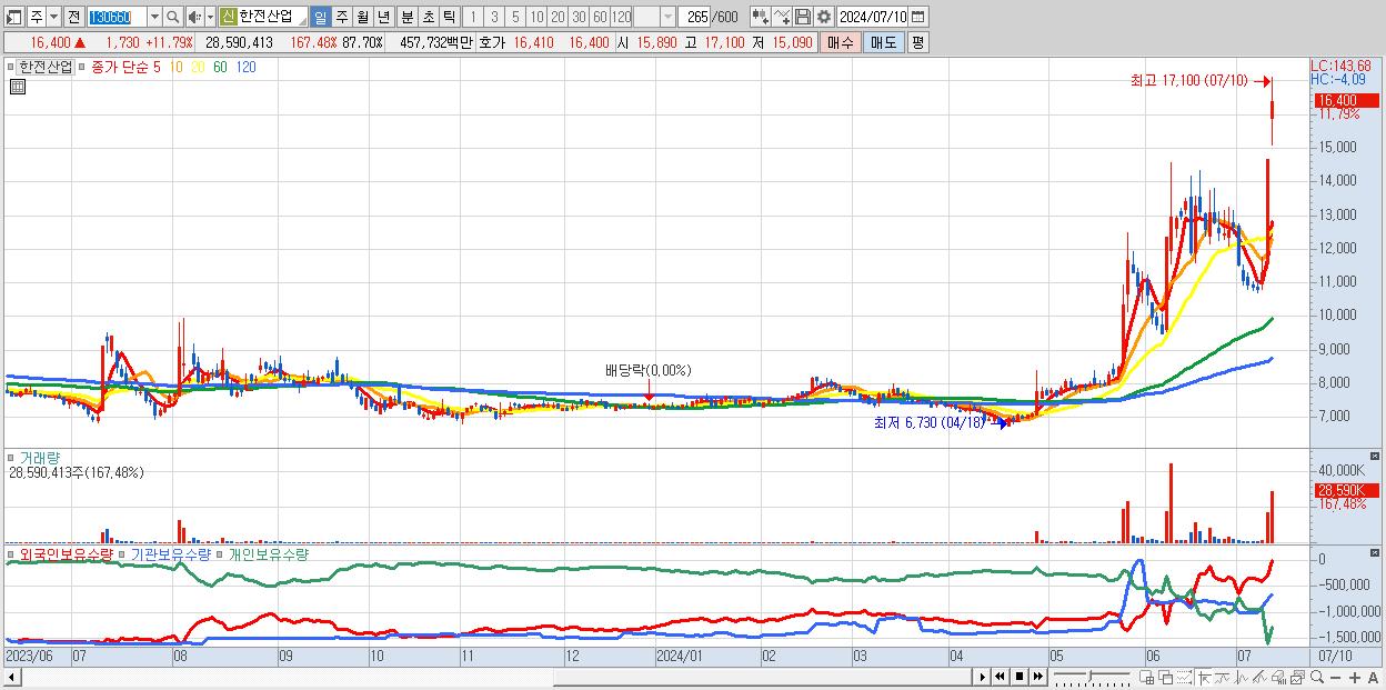 - 한전산업 (16,400원 ▲ 11.79% , 시총: 5,346억, 거래량: 28,590,413, 거래대금:4,577억)