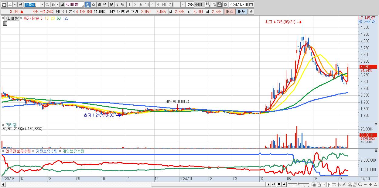 - KBI메탈 (3,050원 ▲ 24.24% , 시총: 1,065억, 거래량: 50,301,218, 거래대금:1,475억)